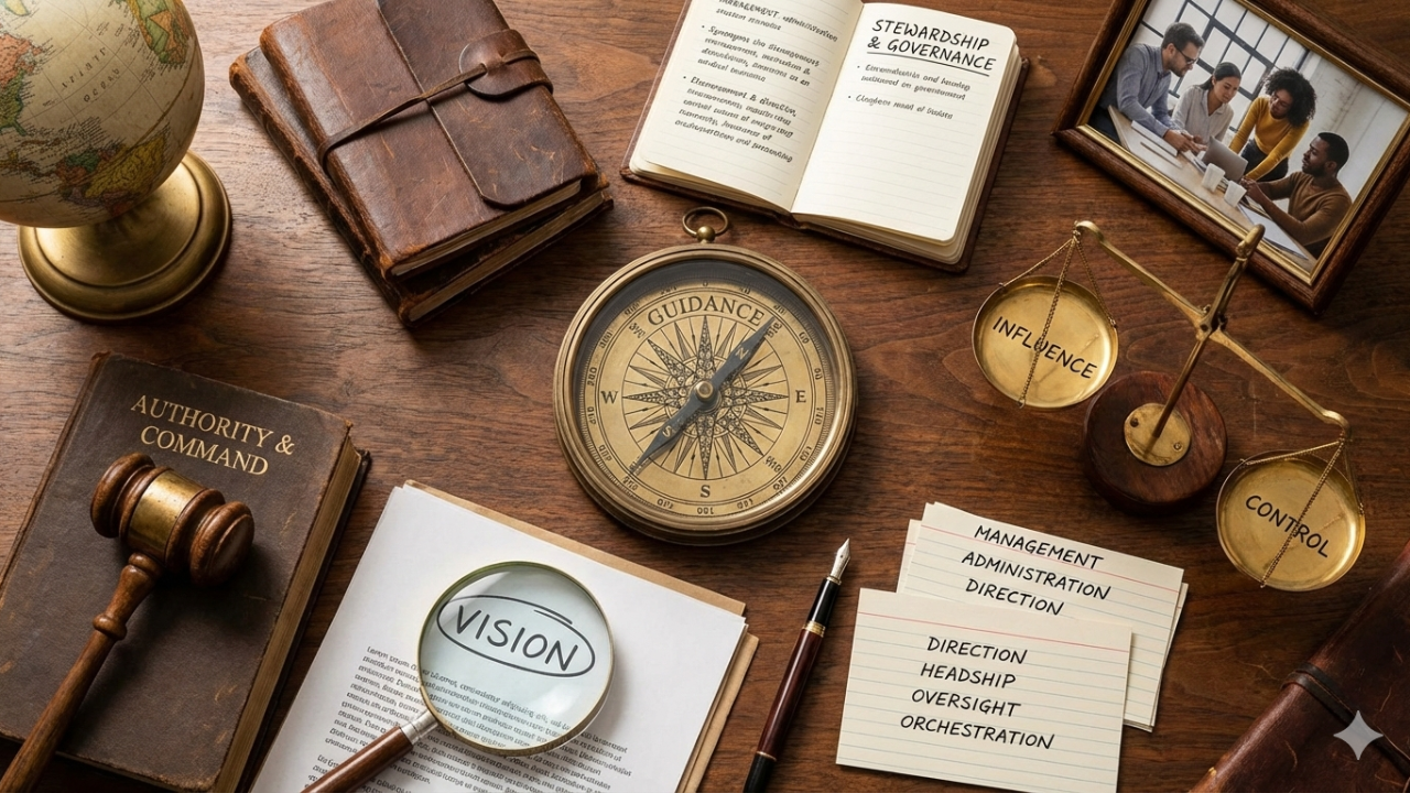 Influence describes the ability to shape decisions without formal authority. Stewardship conveys responsibility for resources and long-term care rather than pure power.